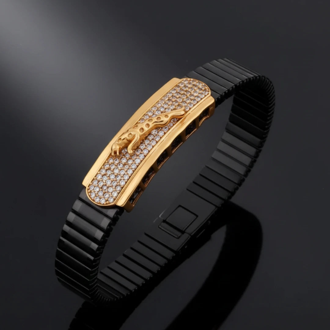 Designed with a striking black ribbed band and a luxury gold-finished centerpiece, this bracelet delivers a powerful, fearless look. The detailed golden motif represents strength, dominance, and confidence, making it the perfect accessory for bold personalities.