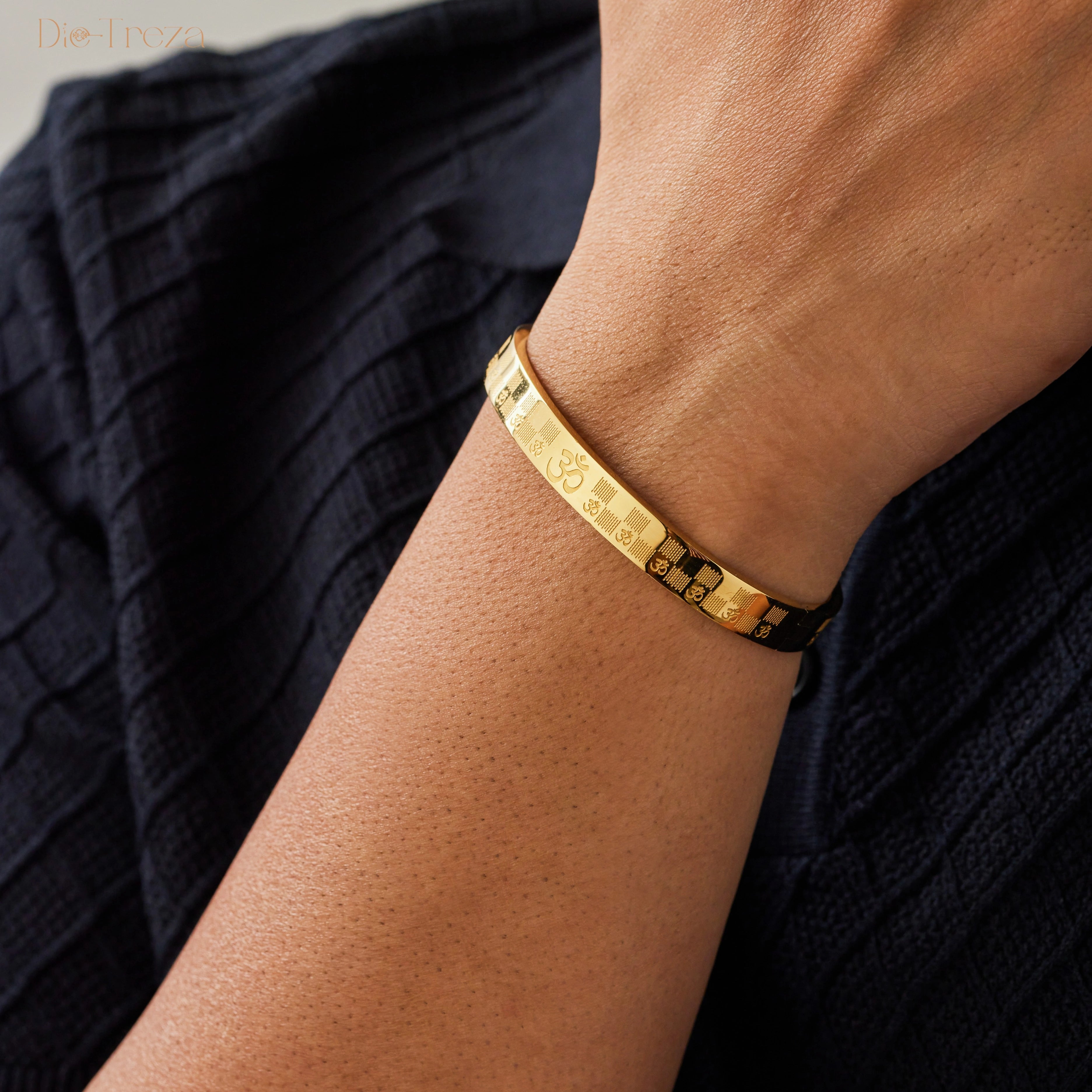 Embrace inner peace with the Om Harmony Kada, a striking gold-toned bracelet adorned with the sacred Om symbol and intricate spiritual motifs. Crafted with elegance, this piece radiates positivity and strength, beautifully complemented by a vibrant red rose that signifies love and devotion. Perfect for daily wear or meditative moments, it’s a meaningful and stylish addition to any jewelry collection.