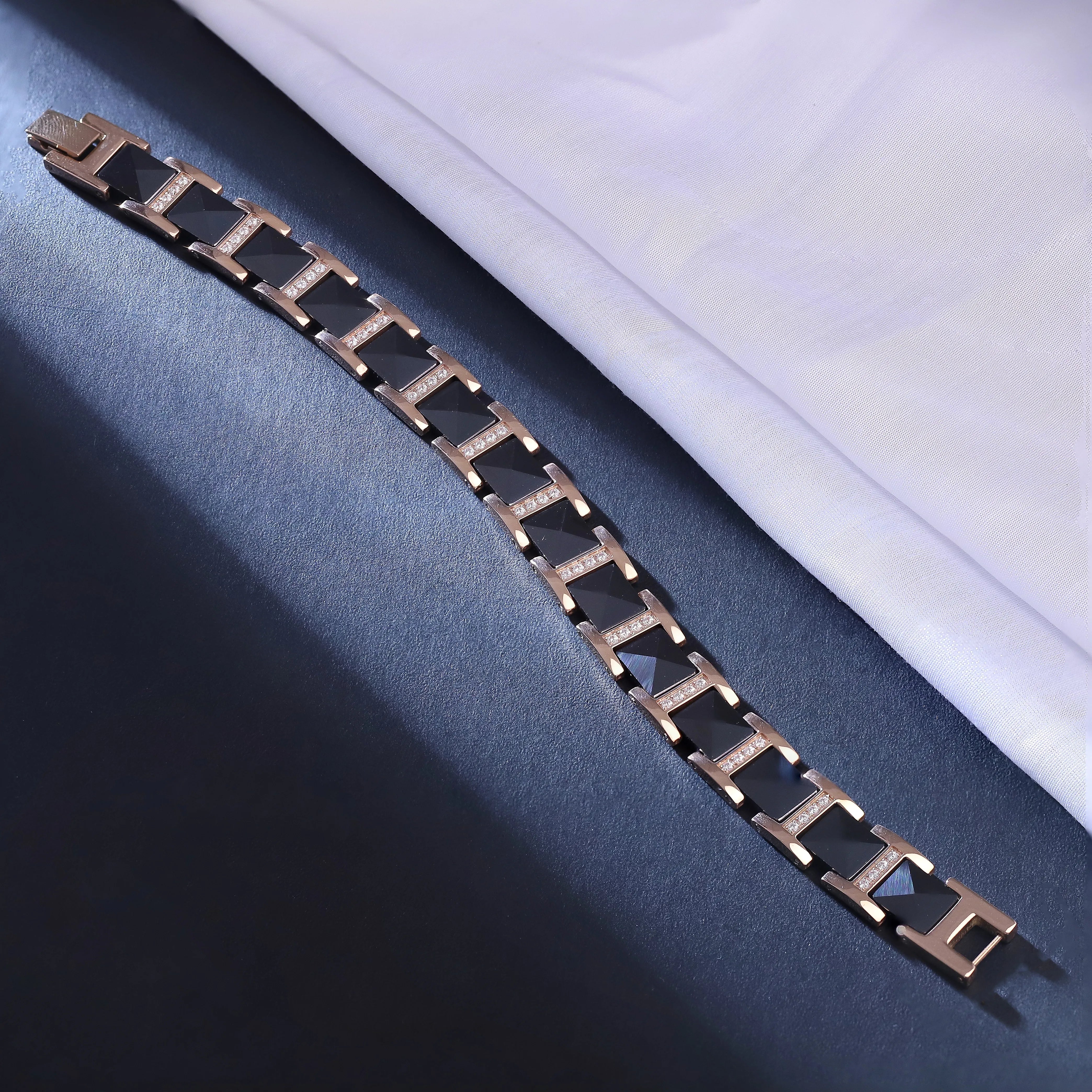 ✅ Design: Bold black ceramic links paired with rose-gold tone accents