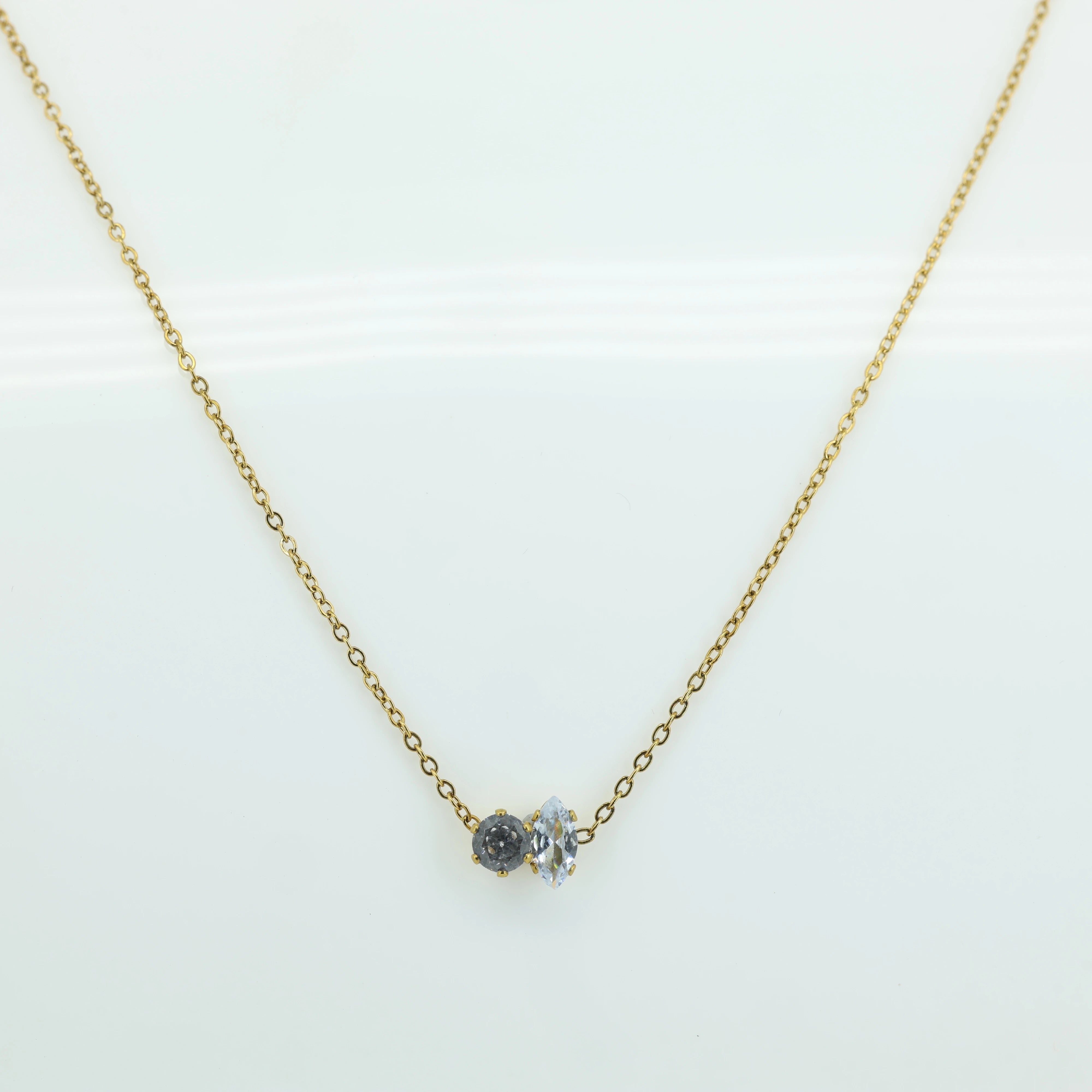 Elegant and minimal, this Twin Sparkle Charm Necklace features a delicate gold-toned chain adorned with two dazzling stones — one round dark crystal and one marquise-cut clear stone. The contrast of light and dark creates a modern yet timeless appeal, perfect for both everyday wear and special occasions. Lightweight, versatile, and chic, it’s an ideal piece to add subtle sophistication to your jewelry collection.